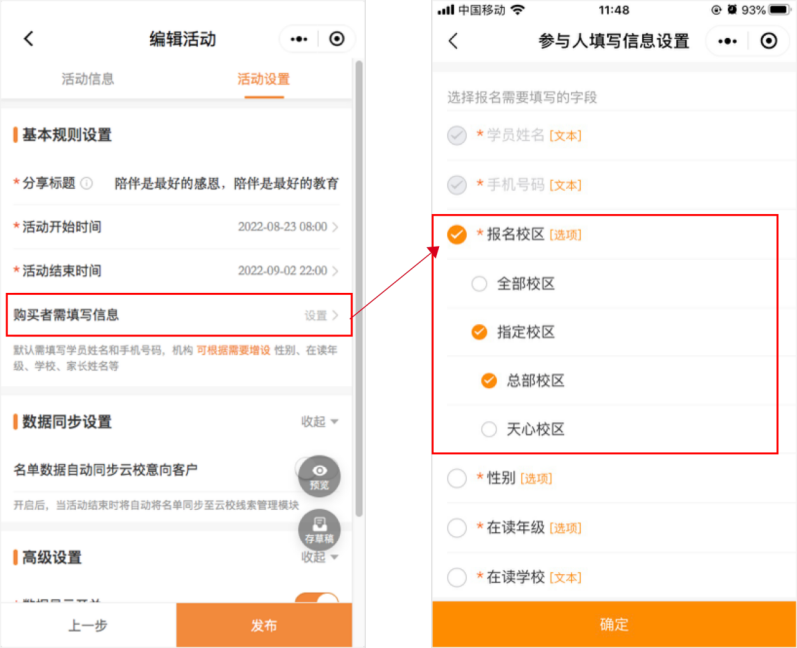 机构进入小竹通小程序,发布“报名、分销、拼团、秒杀、砍价”活动时,设置购买者需填写信息的报名校区,可选择部分校区。